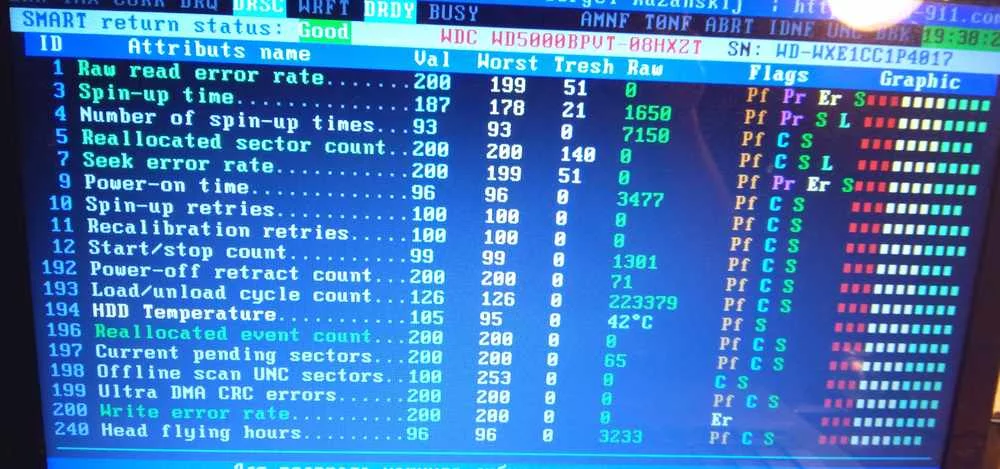 Ноутбук стал тормозить(ему 4 года). Зависает в разных местах. Бывает при загрузке, а бывает и во время работы зависает минут на 10-15. Грешил на Виндовс. Переустановил. Проблема не исчезла. Почитал интернет и решил винт проверить. Загрузился с флешки Victoria и получил вот такой смарт. Решил исправить блоки. Прошел тест Батерфляй с Ремапом. НО бэдов не обнаружено.