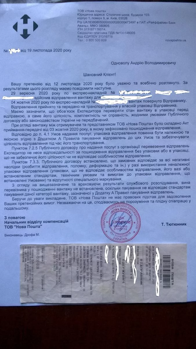 От ёбаной сепарской Деливери я ответ на свою претензию получил спустя полгода после подачи претензии, успел уже с работы той уволиться и забыть об этом. Отписка стандартная - за упаковку отвечает отправитель, пошёл *****.