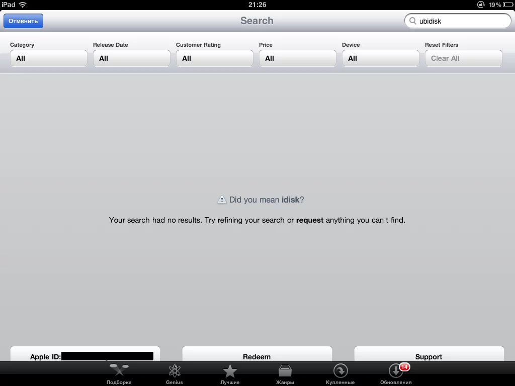 А вот при попытке поиска на ipad (учетка русская, забыл сменить, но результат тот же):