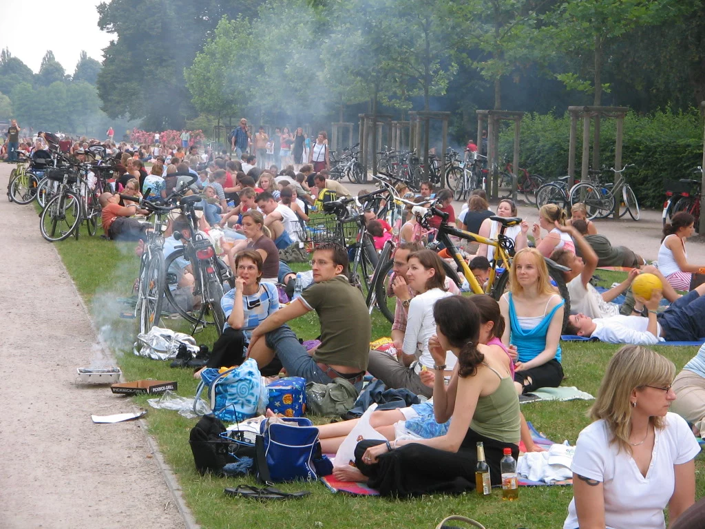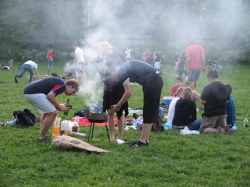 Грилят здесь в парках в определенных местах,одновременно и организованно,последствия такого скопления людей смотрятся так: