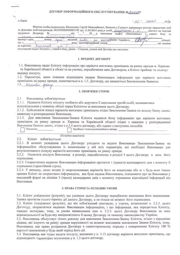 Наверное не новость, что в Харькове работает ряд недобросовестных агентств недвижимости. Заключая «типовой» договор про предоставление информации, который в нам обошелся в 2000 грн. В нашем случае была ситуация, аренды дома посуточно, со 100% предоплатой.