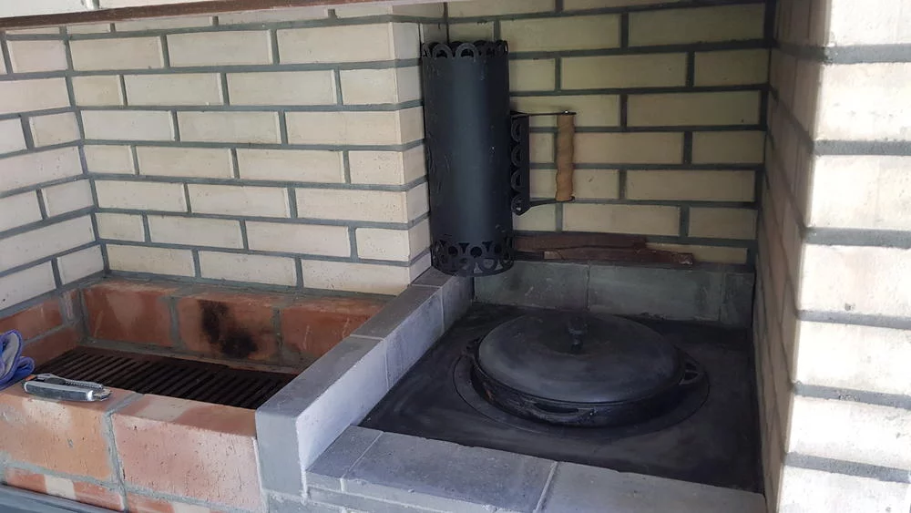 Решетка слева, то вообще то колосники, которые доставать не нужно, на которых горит костер и угли, а шампуры или решетка кладется ровно на верх кирпичей..
