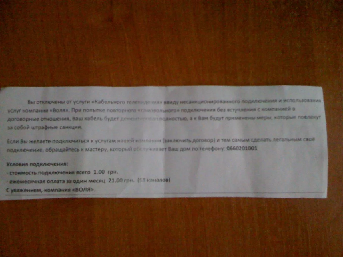 переехали в новую квартиру. опять "здрасьте". сначала счета по 200 грн, потом угрозы, а месяц назад (хотела сразу тут выложить, но меня не вовремя забанили) вообще ох..ли: выхожу из лифта, на первом этаже стоят 2 парня и ковыряются в ящиках для проводов (такие во всех подъездах стоят), ну думаю чинят что-то.. в тот же вечер у нас перестает показывать кабельное, сначала с мужем подумали, что сбои какие-то, на второй и третий день тот же снег на экране, а в двери появляется бумажечка следующего содержания (фото выкладываю)..