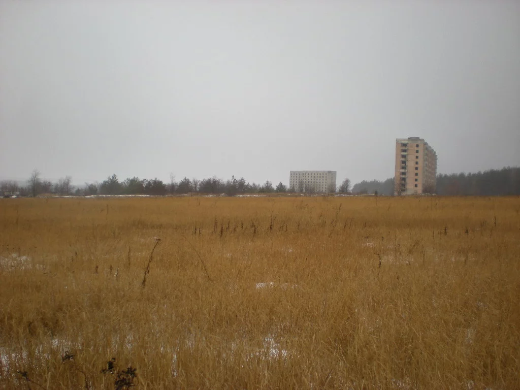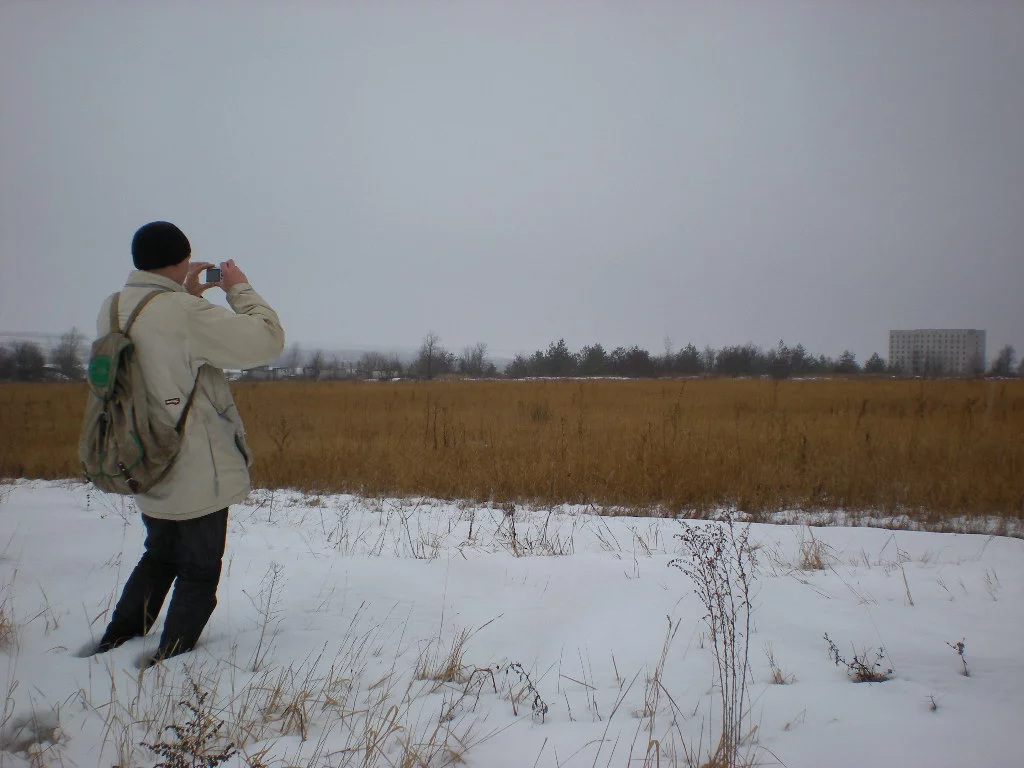 Я одеваю бахилы, а Егор черпает снег ботинками. Мы меняем направление и начинаем идти к центру поля идем, там снега явно меньше. В дали видны черные глыбы на белом фоне. А это значит, что снега на середине поля меньше чем по краям. На горизонте замаячили панельные многоэтажки и мы идем через поле напрямик. Прошли ЛЭП, посадку. Крутой спуск и мы на финишной прямой. Егор так увлекся фотографированием, что даже посадил батарейки. Фонарик приноситься в жертву и батарейки из фонаря перекочевывают в фотик. Пройдя желтое поле на белом фоне, выходим к домам. Настроение тягостное. Видеть погибшие здания занятие не радостное. Труд многих сотен людей погиб зря. Мне как строителю тяжело на такое смотреть. Характерно, что домов было несколько. Два из них уцелели, потому что они слишком большие. Ну как мастодонты. Если ты слишком большой, то тебя уже никто ни трогает. А двум домам повезло меньше. На момент принятия решения о приостановке строительства у них было не больше трех этажей. Поэтому мародеры смогли разобрать их при помощи автокрана.