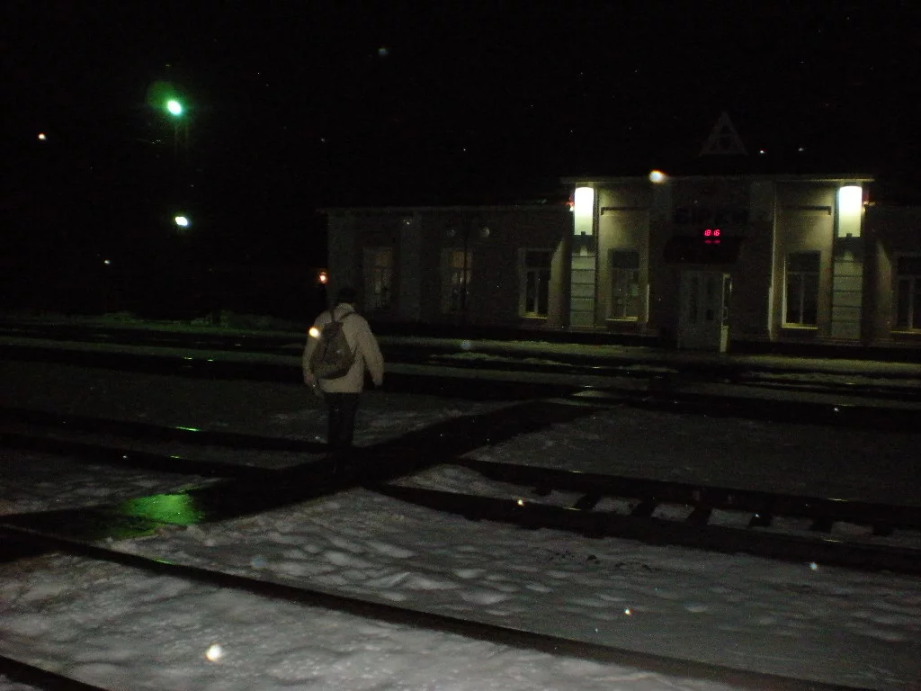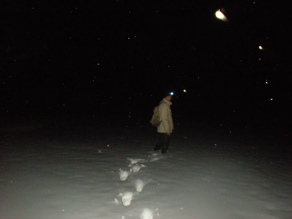 Егор помчался на крышу уцелевшего здания, чтобы сделать пару снимков. Укрывшись в здании от ветра, перекусываем. Время почти пять. Надо идти на станцию чтобы успеть на электричку. Есть шанс успеть на запланированное время в 18-15. Если же мы опоздаем, то ждать нам аж до девяти вечера. Быстро сориентировались по карте и приняли решение идти по просеке через бор. Должно получиться короче. Но как в утверждает народная мудрость, «короткая дорога – знакомая дорога». Начали выходить к озеру, чтобы оттуда рвануть через лес. Снег становится слишком глубоким и мокрым. Начинает ныть колено. С каждым шагом идти становится все мучительней. Совершенно незаметно выходим в прибрежную зону и только когда под ногами начинает потрескивать лед понимаем, что мы топчемся по болоту. Надо выбираться. Пытаясь выйти, оба проваливаемся в воду. Правда быстро выбираемся. Меня спасают бахилы и кулечки на ногах. Егор тоже утверждает что сухой. Почему-то вериться слабо. Быстро смотрим карту и откатываемся назад к протоптанной дороге. Она ведет на хутор, а от туда должна быть проселочная дорога через бор. Идем по дороге и заходим в чей-то очень большой двор. Вдруг из глубины на нас бросается здоровенная собака. Чтобы не искушать судьбу уносим ноги поскорей. Пока не стемнело пытаемся найти эту самую проселочную дорогу. Она уводит нас в противоположную сторону от станции, но приближает к людям. К тому же идти не по дороге я уже не могу. Сразу вспоминается основная задача нашего похода. А я сетовал, что «инвалидов не подвезли». Наткнулись на чьи-то следы ведущие в сторону станции. След идет в обоих направлениях. Тропинка!!! И несмотря на то, что это не утоптанная дорога мы быстренько шагаем по ней. Как только вошли в лес, то сразу стало стремительно темнеть. Такое ощущение, что начали выключать свет перед представлением в театре. Тропинка пошла в гору и колено свело вообще. Надо делать перерыв. Торможу Егора и смазываю колено Дип Релифом. Егор перезаряжает свой фонарик. Я тоже вынул свой прожектор. После мази стало немного легче. А тропинка уходит все выше и выше в гору. Я думал, что она никогда не закончится. Однако все кончается. Выскочили из леса и перед нами светятся огни нашего конечного пункта пос. Борки. Следы по которым мы шли начали путаться. Прикинув направление решили идти через поле. Егор идет первым и торит дорогу, а я уж по его следам стараюсь не отставать. Ну как мы не торопились, но электричку мы все же не успели. Мы опоздали буквально на две минуты.