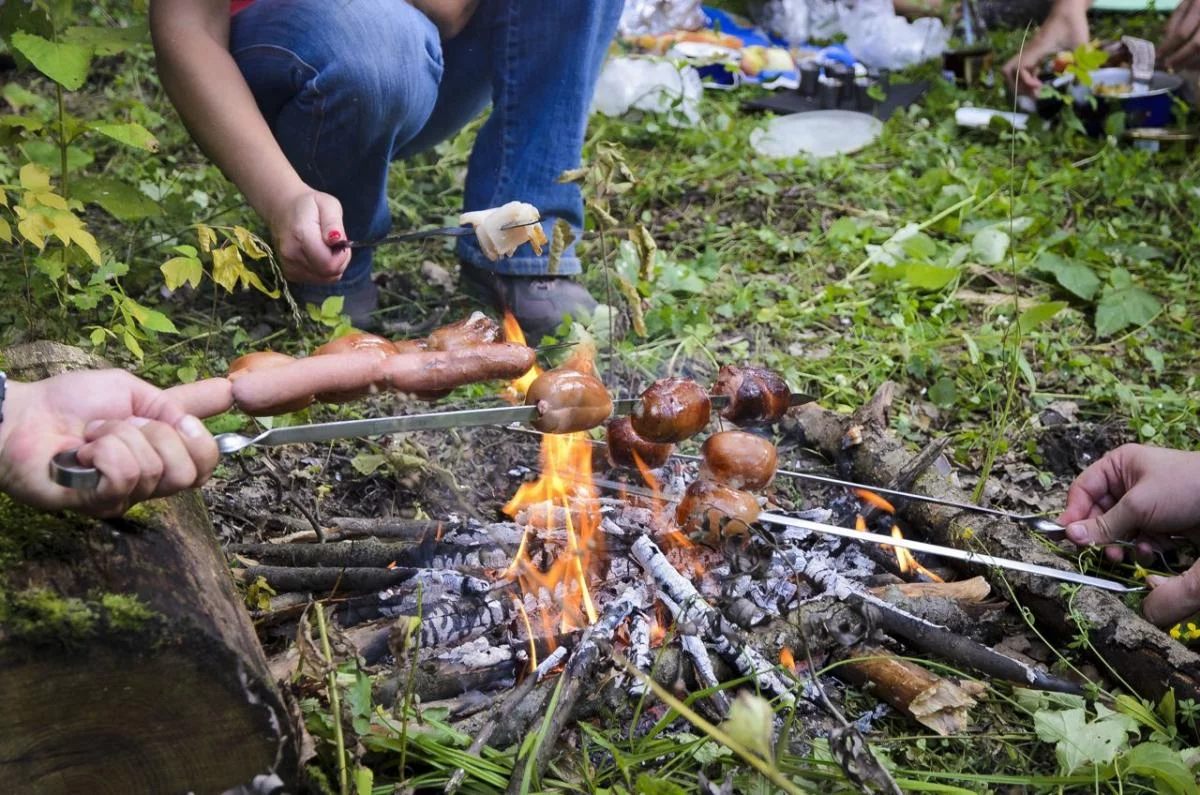 Судя по маникюру, синие джинсы это барышня, рука, с тремя сосисками, судя по сосискам, кавалер, судя по шампурам еще четверо...