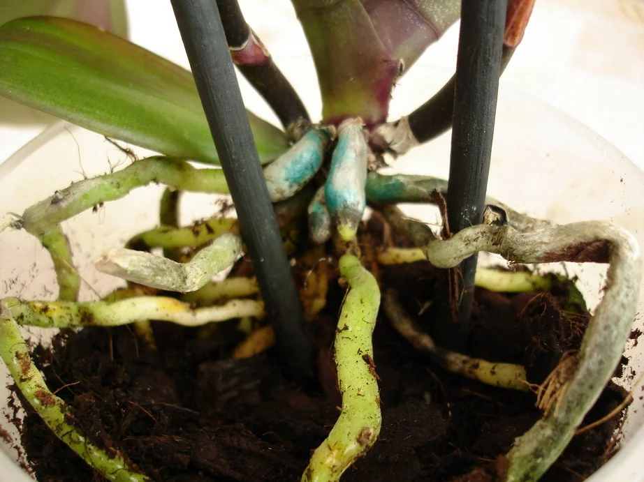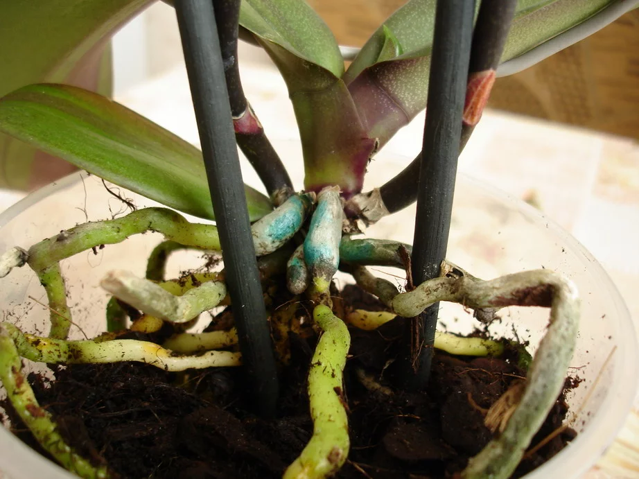 Опасение вызывает только картина на фото 2. Листья в тургоре, значит корни работают. Желтые корни не от загнивания. Желтый цвет у корней, которые были внутри горшка и не видели белого света. Это обычное дело.