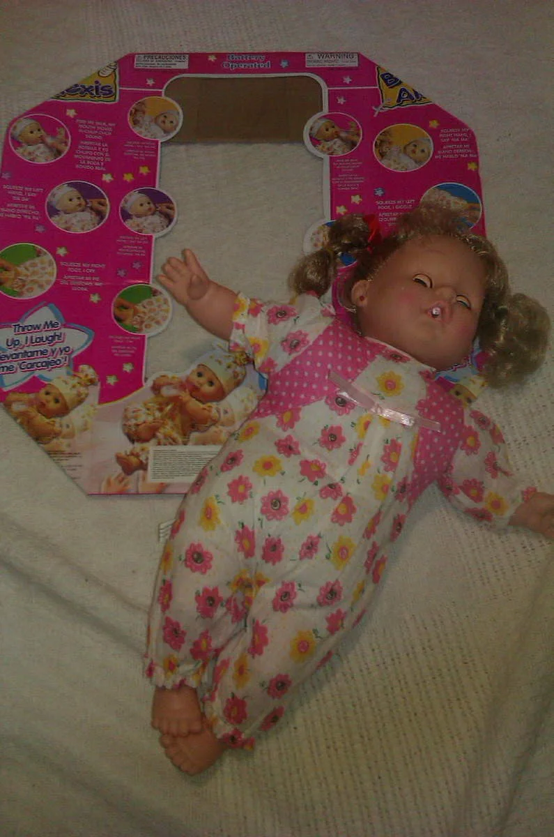 5) Из-за того, что куклы транспортировались без коробок, бутылочки с "молоком", которые прилагались к этим куклам, были повреждены, и часть (кончик) бутылки осталась во рту у одной куклы, у другой куклы из бутылки частично вылилось содержимое.