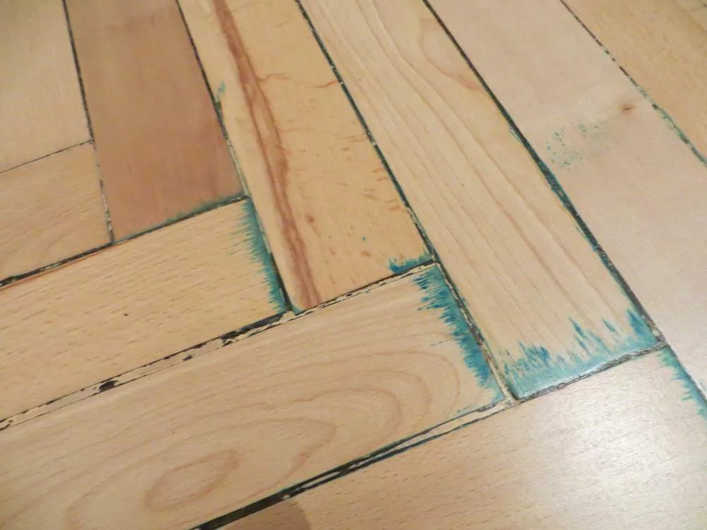 Также под слоем паркета обнаружилась разлитая зеленка, которую они без предупреждения вскрыли лаком в центре комнаты!