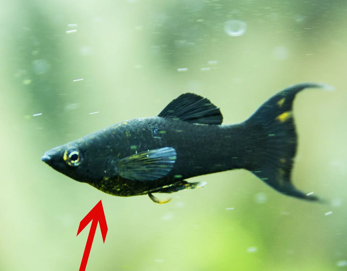 У молли появились жемчужно золотые пятна на пузе, у одной - белесые полоски на боку. Животы немного раздуты. Чешутся животами.