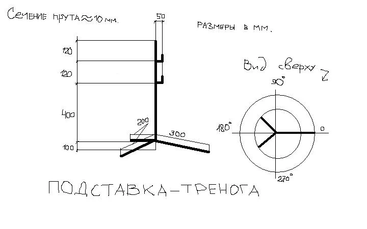 Сегодня в одном из веломагазинов видел поставку под велосипед. Очень удобная - велик стоит ровно и можно крутить педали, и в то же время элементарная в изготовлении. С их согласия (они ими не торгуют) снял мерки. Вот чертеж. Рисовал в Paint, т.к. A-CAD и Visio дома не ставил, так что вышло немного коряво, но чертеж элементарный, так что смысл понятен.