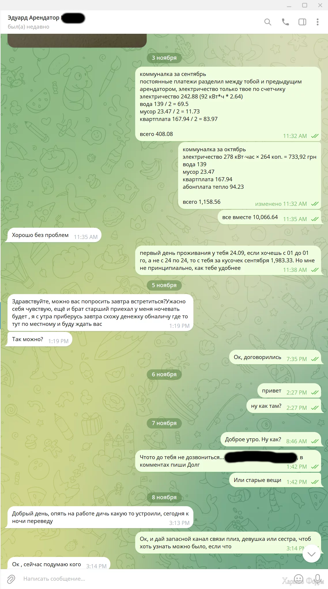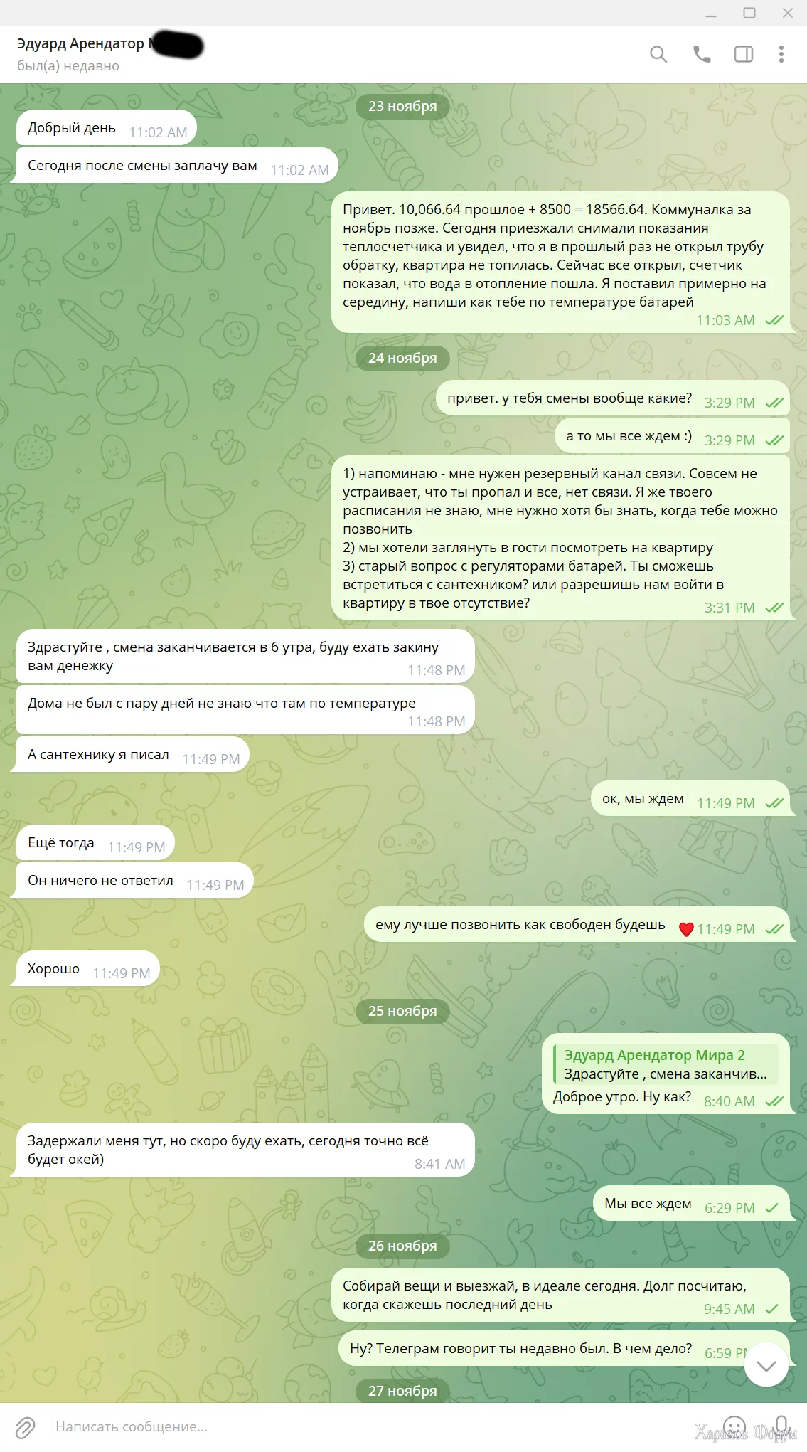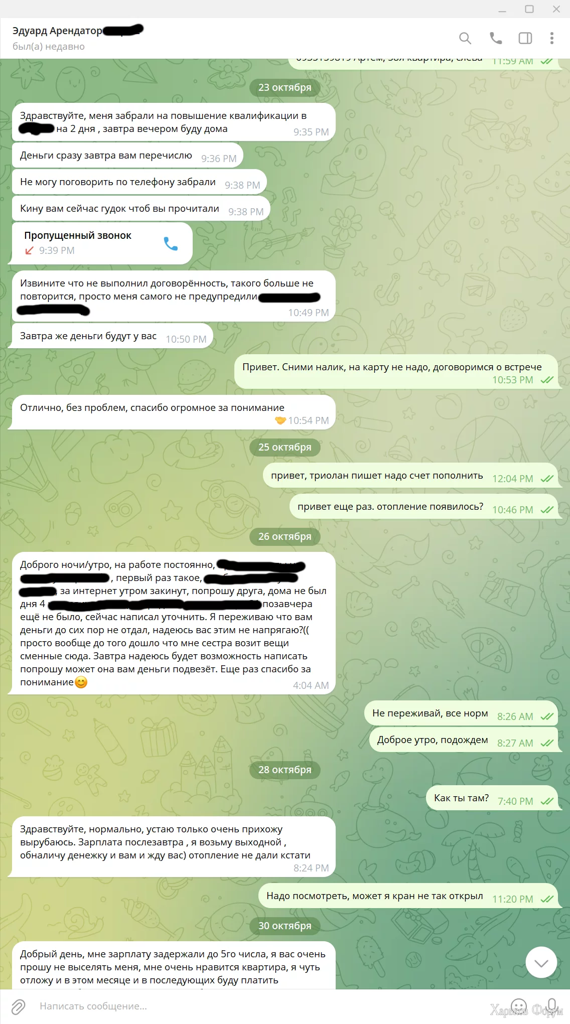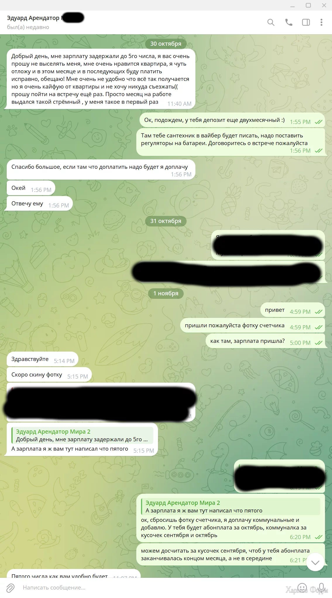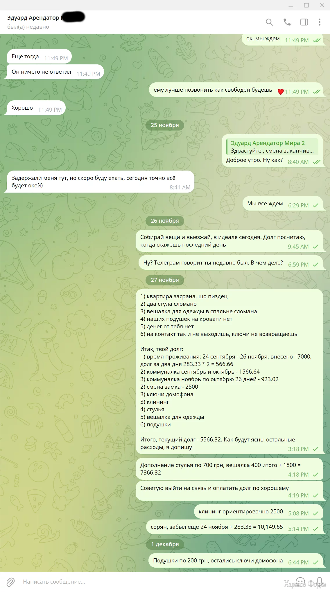Заехал в квартиру в сентябре, первый день 24.09, сдавали через агентство, внес депозит на два месяца (месяц проживание + месяц страховка). После месяца проживания он просил отсрочку несколько раз, мы пошли навстречу, вплоть уже до двух месяцев с небольшим. А он потом тупо свалил с квартиры и оставил ****, сломал подставку для одежды и два стула, ключи не оставил. Звонки, SMS, мессенджеры - бесполезно. Все долги (коммуналка, клининг, замена секретки и т.д.) затянули на 10к+. Прикрепляю переписку и паспорт без номеров для соблюдения законодательства.