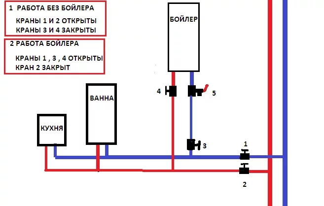 Особенно видно расположение кранов на бойлере(которые надо перекрыть) и на стояке(которые надо открыть)