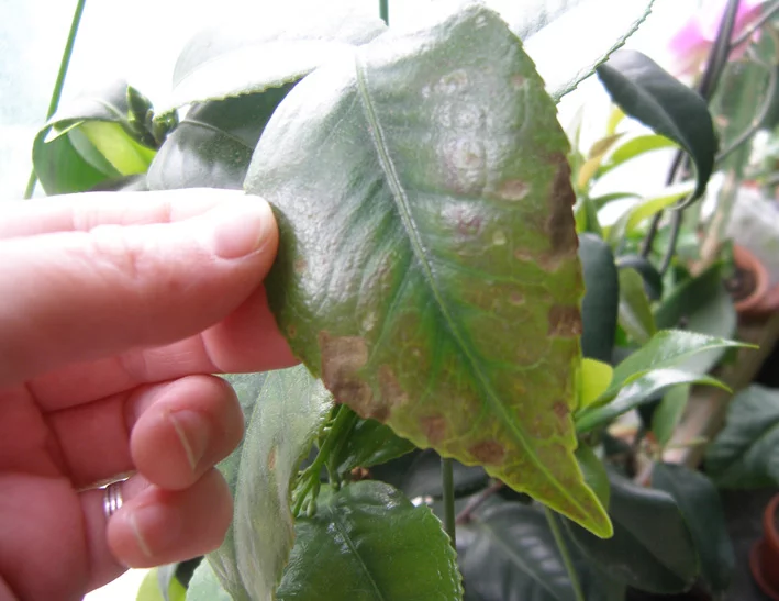 Сейчас у них активный рост, и на молодых листьях появляются светлые точки. Потом они темнеют, некоторые остаются точками, а некоторые превращаются в пятна, и вокруг них лист теряет цвет. Некоторые пораженные молодые листы даже отваливаются. Старые не болеют.