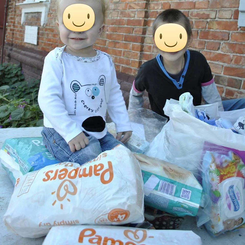 передала семье памперсы 5 для Руслана, памперсы 4 для Мирона, витамин Д, салфетки влажные и большой пакет с детским постельным бельем.
