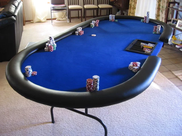 У меня есть специальный стол для покера (сфоткаю, выложу) 8-ми местный 1830*1000 мм, без места для дилера (это отличие от столов казино где дилер сидит посередине стола), обтянут синим сукном, мягкие борта цвета слоновой кости, ножки хромированные съемные.