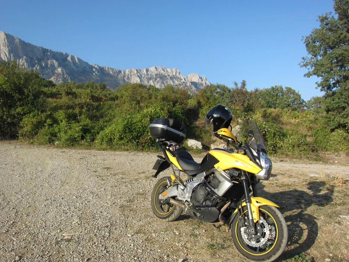Выехали в пятницу, но вместо запланированных 17, в 19 часов. Проехали бетонку и встали на ночевку в первом же мотеле. Приятное место. На след день проспали выезд. Стало понятно, что едем не спеша. Останавливались то тут, то там, прибыли в Симеиз затемно. Ездить по серпантинам в темноте полное обсцыкалово, по крайней мере для меня. На след день поехал прыгать со скалы, как-то бодро прошел вверх по гравийке, но хорошо, что не далеко - решил дальше не рисковать. Назад еле спустился: моцик несет, практически не управляем. В итоге в 2 метрах от асфальта таки улетел в траву. Поднимал минут 20. Взмок насквозь. По повреждениям - небольшая царапина на пластике - дуги решают. Больше с асфальта съезжать не буду. Остаток времени катали по городу, познакомились с прикольными ребятами, катали их, сидели в кафехе, короче море - это прикольно. Назад ехали по серпантинам днем - нереальный кайф - широкие повороты, идеальное покрытие, я порой даже забывал смотреть на море.