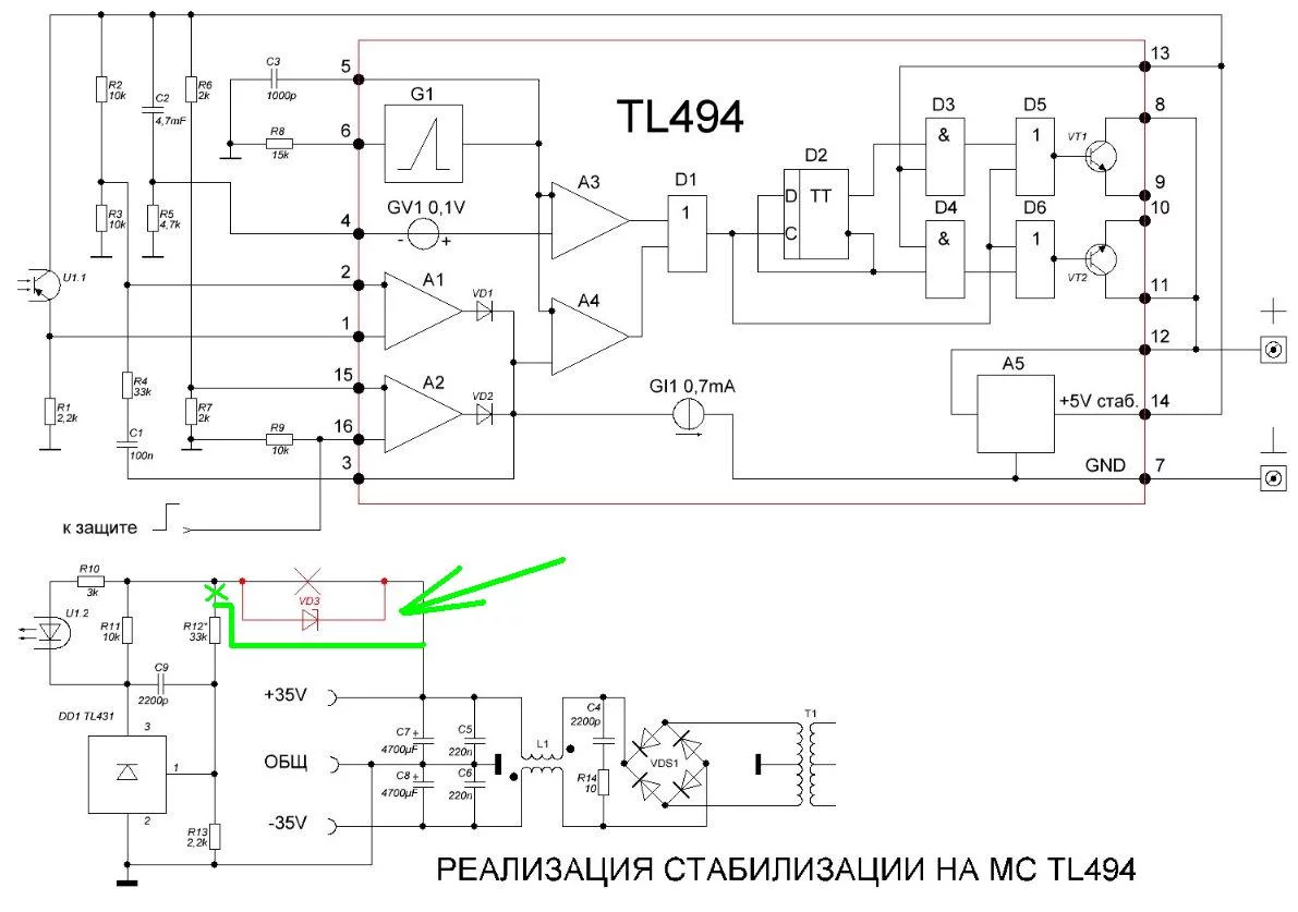 Возник вопрос, а правильно ли показано включение этого стабилитрона? Потому-что в этом случае стабилизация работала не коректно. Сейчас переделал как показано зеленным П.С. У меня питание не +\-35 , а +\-60В. Я поставил стабилитрон на 30В.рабочее напряжение TL431 не должно превышать 36 вольт. А как быть, если от схемы требуется получить, например, 50 Вольт? Достаточно в разрыв контролируемого плюсового провода поставить стабилитрон на 15…20 Вольт (показан красным цветом). В результате этого он «отсечёт» лишнее напряжение (если 15-ти вольтовый стабилитрон, то он срежет 15 Вольт, если двадцативольтовый- то соответственно уберет 20 Вольт) и TL431 будет работать в допустимом режиме напряжения.