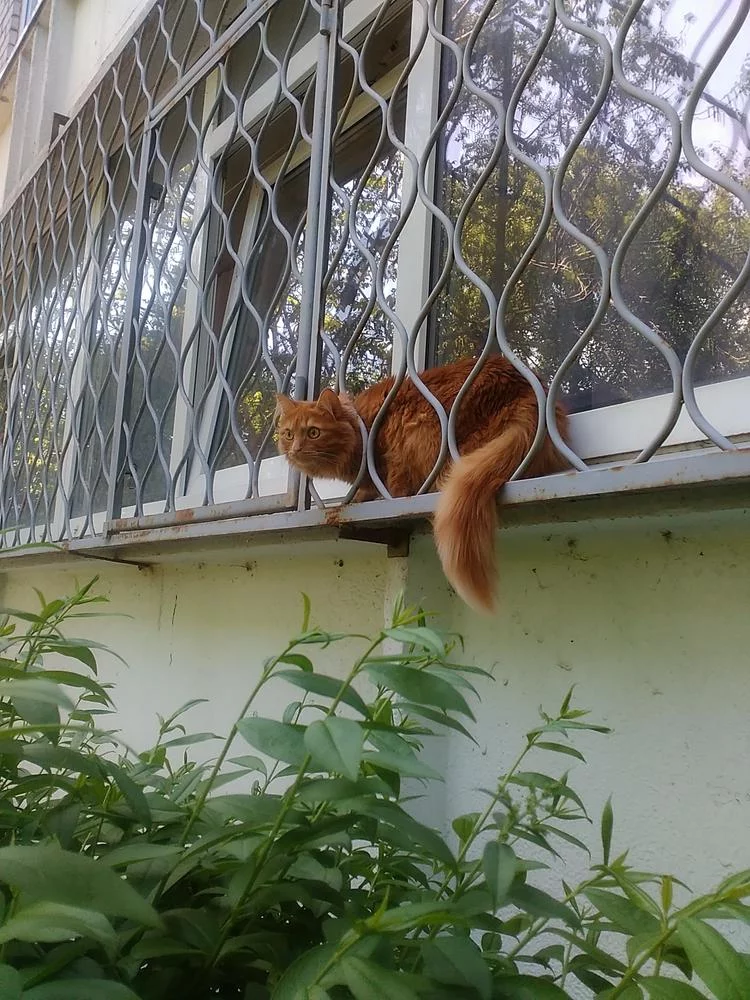 Так вот . Нарисовался котэ . Тоже просунул физиономию в сторону реки , так что в сторону тротуара сияет хвост трубой и свисток на показ .