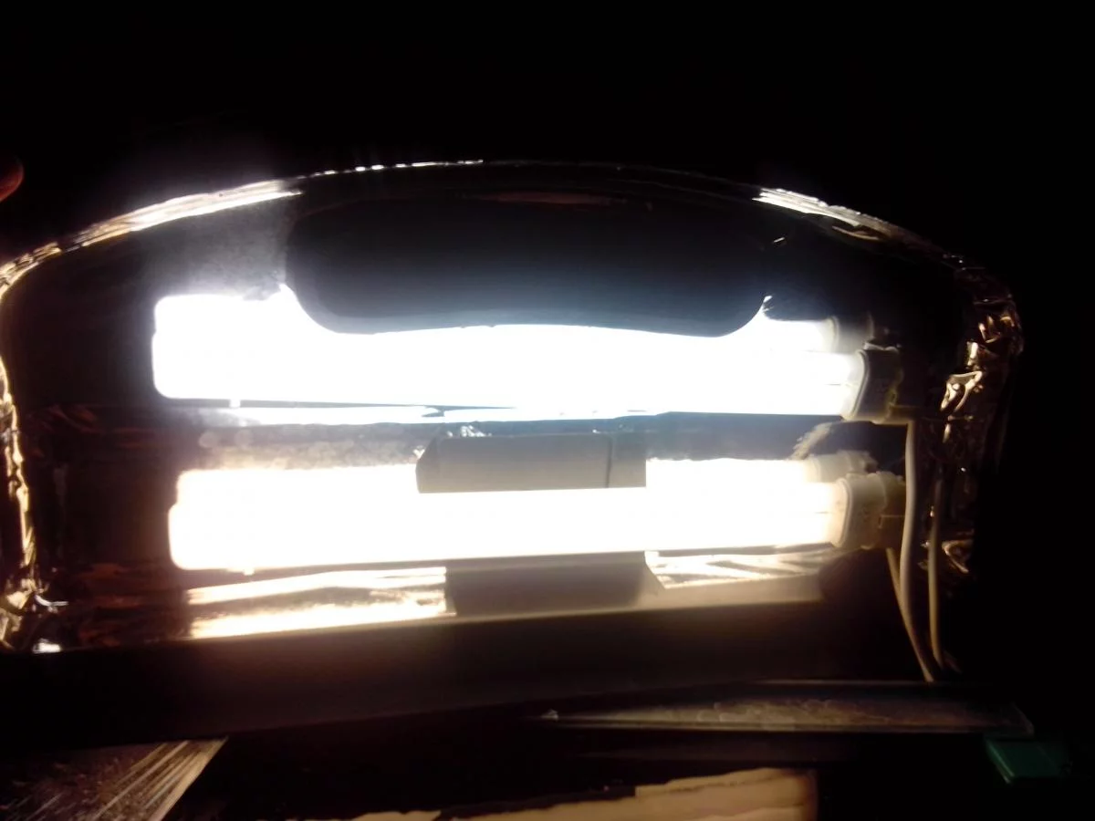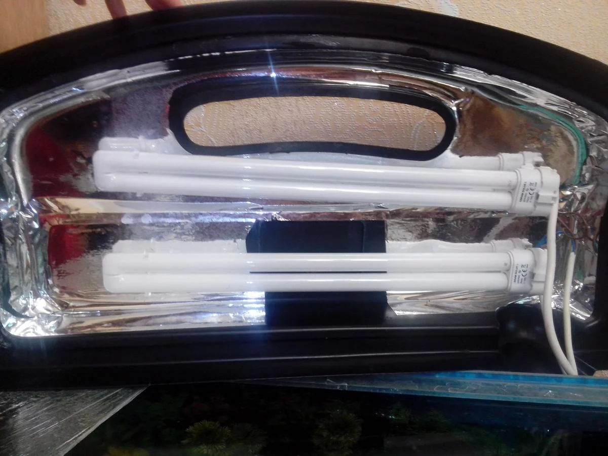 Купил аквариум с выпуклым передним стеклом. Размеры банки (д\ш\в) 60х25(32)Х50 см.Объем 80 литров. На крышке(фото) стоят 2 экономки по 20 ватт 4000к. Теоретически света хватает на обычный аквариум(не травник). Но середина аквариума немного затемнена.Решил добавить одну лампу трубчатую для увеличения мощности освещения и для подсветки середины. Место расположения лампы показал на фото.Но тут столкнулся с проблемой. Максимальная длина крышки 50 см. При такой длине нашел единственно подходящую лампу.Это Т8 15W 43см.Так же отдельные герметичные патроны к ней(фото). Не могу в Харькове найти ЭПРА на 15W по нормальной цене.Вернее в Харькове вообще таких нет.Кто что может подсказать по этому поводу(принимаю критику и советы)?Может кто то переделывал свет и сталкивался с такими проблемами.В смелых мечтах хотелось бы иметь медленно растущий травник. СО2 и УДО не планируется.