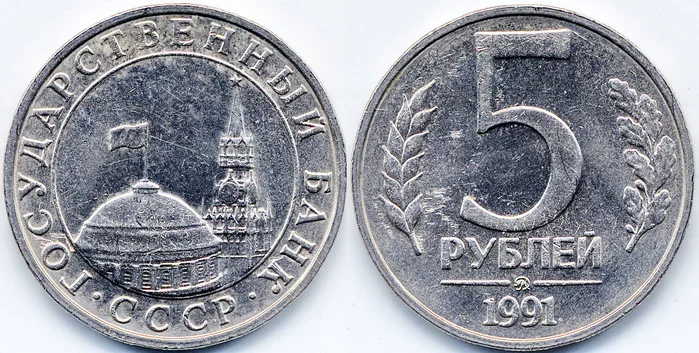 Прошу подсказать по монете .Есть 2 монеты СССР-номинал 5 руб.Белый металл,1991 года.По каталогу не нахожу таких.Имеет ли какую-то ценность?