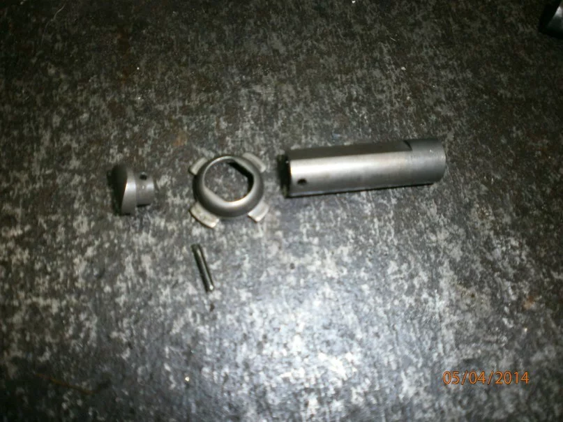 Внутри есть шток для фиксации при установке(то что мне не понравилось).Его максимально вытаскиваем и отрезаем.Вытащить и выбросить целиком не получилось так как головка на нем больше чем 10мм.Но он нам немножко необходим чтоб пружина напрямую не упиралась в саму рейку натяжителя.А выбивать ось собачки на рейке не захотел