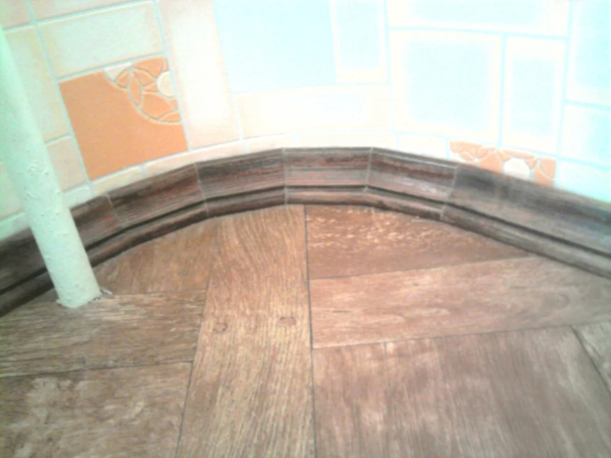 У нас дурацкие закруглённые бетоном углы, поэтому в них, как понимаю, придётся заказывать уголки для плинтуса под наш радиус, мне посоветовали из пробки заказать.