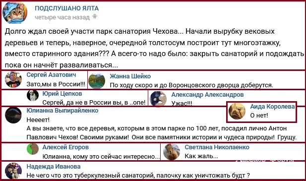 Варвары продолжают свое грязное дело: "Неееет! А вы знаете, что все деревья, которым в этом парке по 100 лет, посадил лично Антон Павлович Чехов! Своими руками! Они все памятники истории и чудеса природы! Грущу", "Походу, скоро и до Воронцовского дворца доберутся"...