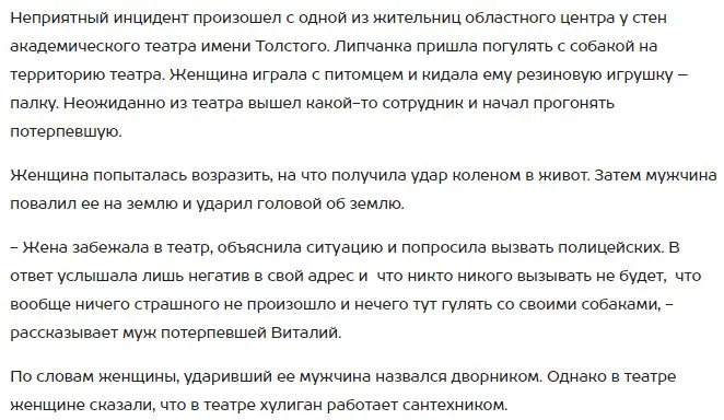 Администрация Липецкого театра дамы имени Л.Н.Толстого сожалеет, что их "сантехник" избил женщину, гулявшую с собакой у театра, за "отказ выполнить его законную просьбу".