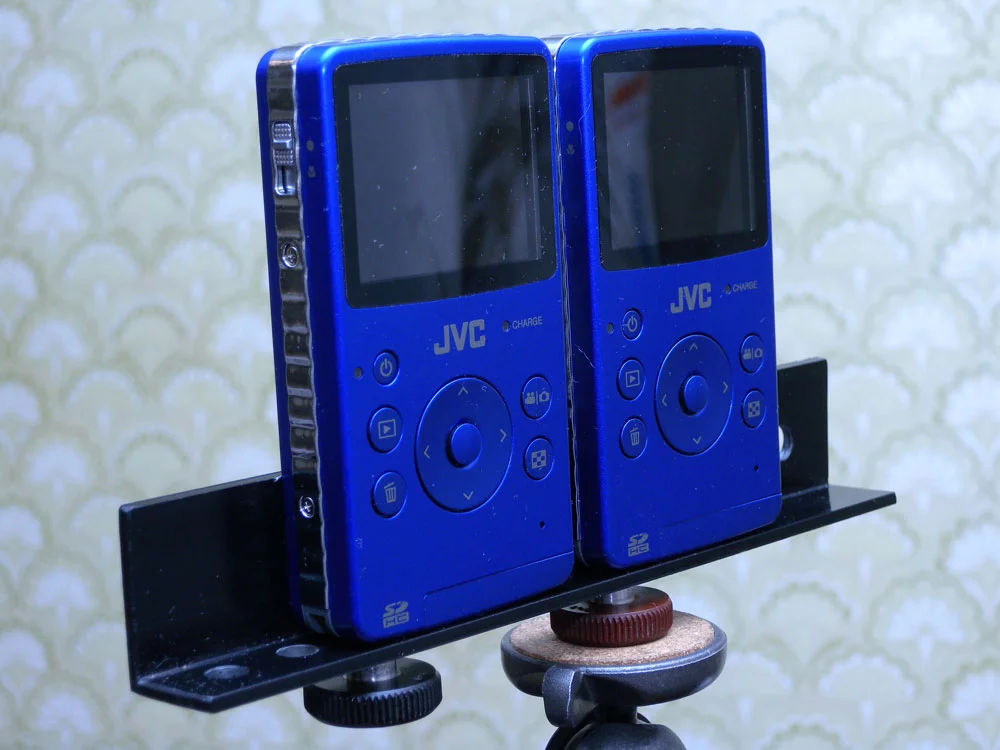 Итак куплена пара камер. Отрезан кусок пластикого уголка, в нём просверлено несколько отверстий с шагом 15мм, для ступенчатой регулировки стереобазы. На полке найдена пара винтов для крепления фотоаппарата. Собственно и вся работа, спарка готова. Прямоугольный корпус вертикальной компоновки это идеальный вариант для спарки.