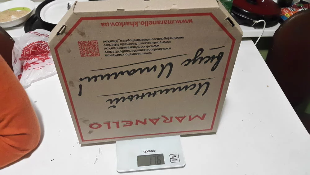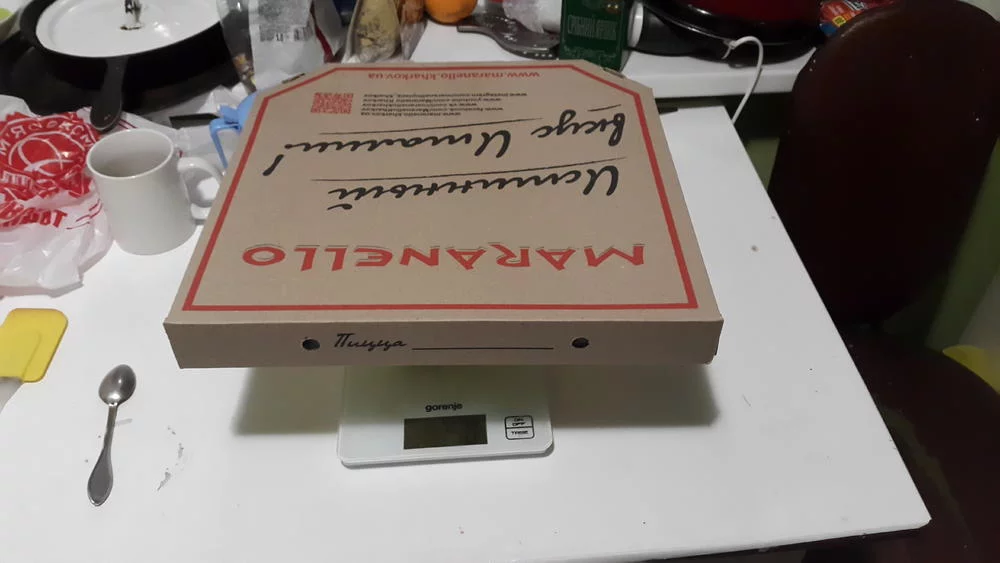 Пицца в коробке!!! весила 790гр., а должна без коробки весить 830гр., а коробка весит 176гр.. Я ещё скину 14гр. на прилипшие к коробке остатки пиццы и даже с этим в этот раз недовес составил 200гр.!!! или 30грн. :відстій: