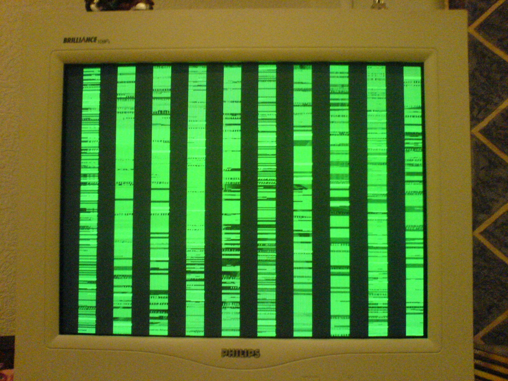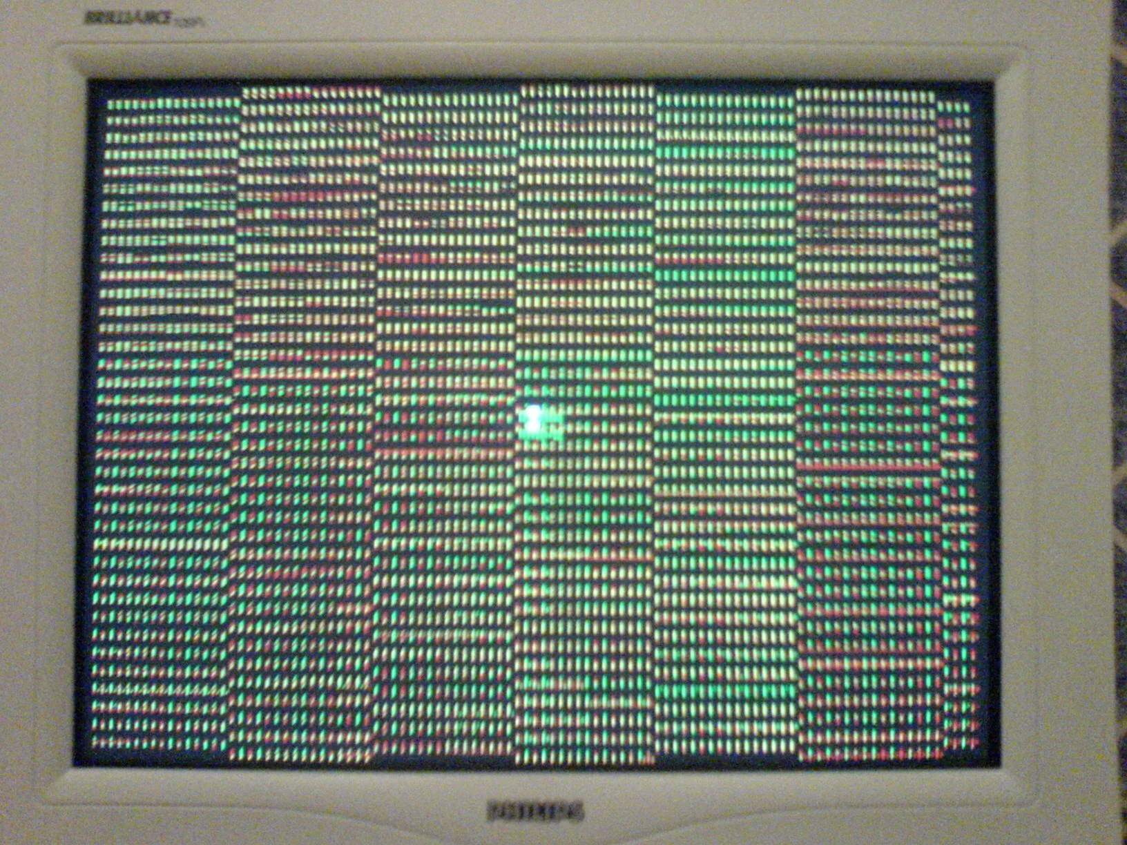 )Пыль, окисление контактов, неравномерно установленная в слот плата.Radeon 9800 pro. В биосе всё о.к. Пропылесосил, вроде бы пропала эта хрень! Поживём увидим...