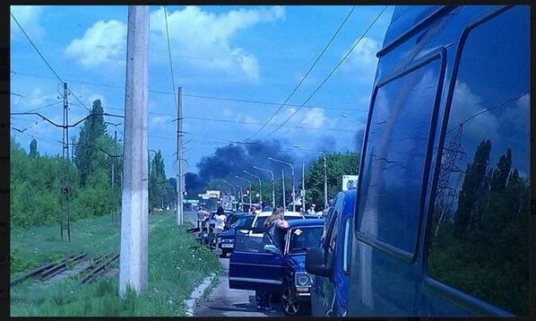 Центр #Краматорска. Подожгли маршрутку и троллейбусы. Ждут танков. Вид из гостиницы "Коамаиорск"