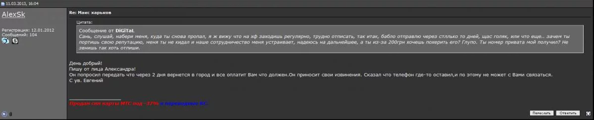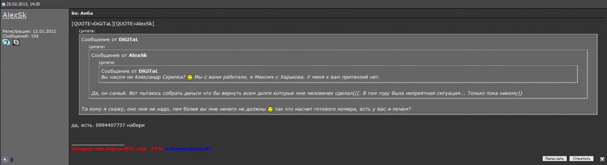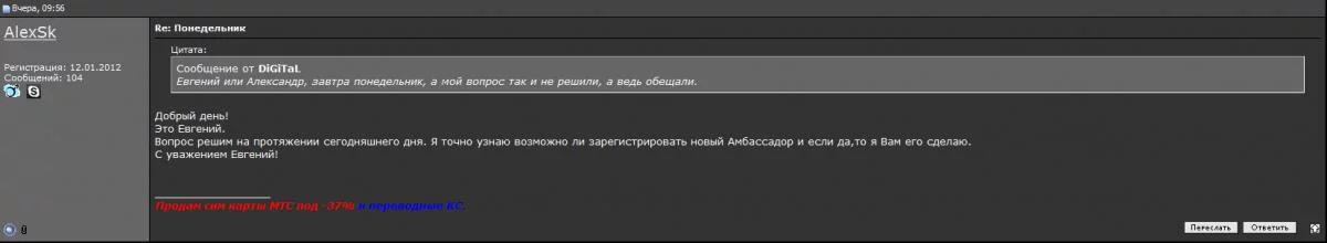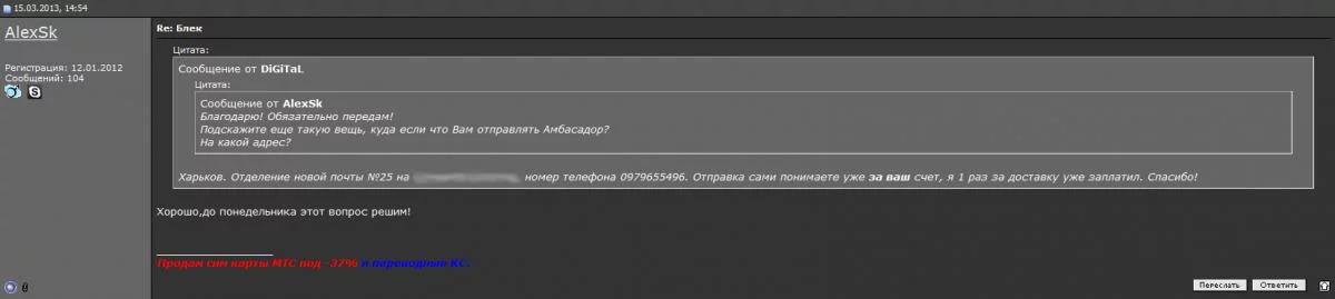 И вот не так давно понадобился мне амбассадор снова, написал в личку человек с ником AlexSk не трудно догадаться что именно он, позже это подтвердилось. Предложил купить у него готовую амбу за 200грн, меня вариант устраивал, договорились, что он высылает новой почтой симку, я проверяю и отсылаю деньги.