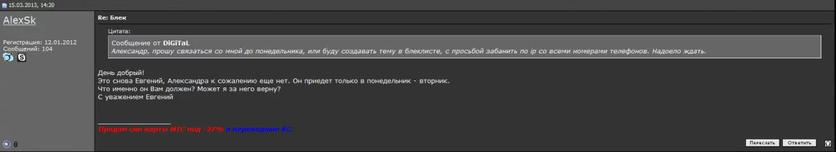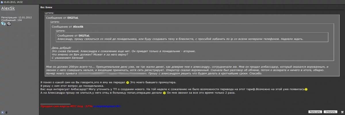 Звоню Александру, так мол и так, есть проблема, что делать. Было предложено в течении нескольких дней выяснить ситуацию и восстановить номер. Но прошли эти дни, ничего. Звоню, Александр говорит, что я вышлю тебе другую симку амбы, не вопрос, жду, проходит еще неделя, ничего. Периодически Александр не берет трубку, ссылаясь на то, что забыл телефон на работе, оба телефона видимо, т.к. номера 2.