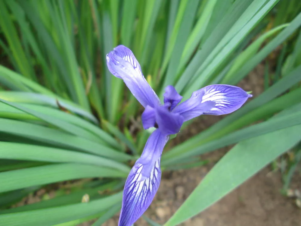 Ирисы, скорее всего молочный. Беспроблемное и весьма декоративное растение. Взрослый куст выглядит как злак, но в отличие от злака не расползается по цветника. Листья никем не поедаются и ничем не болеют.