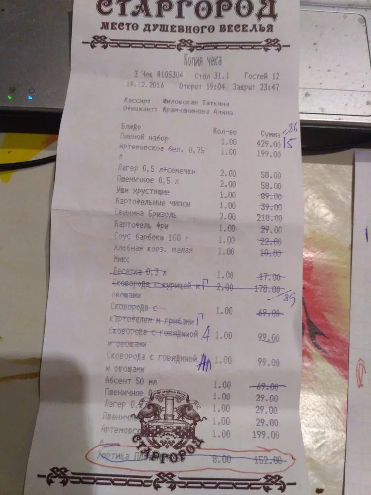 Всем добрый день. Решили компанией отпраздновать праздник Николая в Старгороде. Давненько именно это заведение нами не рассматривалось и не посещалось, но года два назад мы его регулярно посещали и есть с чем сравнить-что было и что стало. Компания из 11 человек. Забронировали места еще в конце ноября и внесли на карту сумму исходя из 300 грн на человека. Когда подошло время расчета (считали на общий чек, но сам чек нам не дали, а сумму озвучили вслух.) меня удивила общая сумма (она превышала ожидаемую) и я попросила предоставить чек. Очень долго мы его ждали, более 30 минут и по итогу нам его предоставили в таком вот виде (фото стр 1 и стр2). Часть чека вообще выписана была вручную и официантка сказала что по другому не печатается. Итого в этом чеке так же отсутствовало. Когда стали смотреть по позициям (гуляли мы долго и многие были уже на веселе) в глаза бросилось наличие в чеке Хортица ***** 8 ед на сумму 152 грн. Но разбежность была гораздо больше,после более детального изучения чека- дописанную бутылку шампанского (мы его пили, но на одну бутылку меньше (199 грн), хлеб на сумму 20 грн (мы его заказывали,но в меньшем количестве и один раз и в чеке об этом есть пунк на стр 1) , Вода без газа0,33 на сумму 18 грн, и так же нам туда доплюсовали лишних 3 бокала пива по 0,5 на общую сумму 87 грн. Так как кто то в процессе ушел раньше,кто то позже и расчитывались до выдачи чека,с учетом уплоченных ранее 300 грн, к сожалению не все позиции сразу удалось подсчитать и на месте мы сразу подняли вопрос о водке которую 100% никто не заказывал. Деньги за нее,после переговоров, нам таки вернули. Остальное выяснилось уже поутру,когда начали сводить баланс. Сколько раз мы гуляли дружной компанией в заведниях Харькова но вот ни разу ничего подобного никогда не наблюдалось. Никогда не пытались воспользоваться расслабленным состоянием гуляющих и вписать под это дело дополнительные позиции дабы увеличить сумму чека. На фото обведено на чеке стр 1 внизу *****, на второй хлеб и вода. Шампанское не обводила тк оно одного вида и в одну цену-Артемовское 199 грн и в общей сложности нами было заказано 5 бутылок, а по итогу заплатили за 6. Остальные пометки -это мы вычисляли кто,чего и сколько и для удобства ручкой делали пометки. Да,понимаю что такие вещи нужно проверять не отходя от кассы и после уже доказать что либо просто невозможно. На сайте Старгорода написала им о данной ситуации,но отзыв быстро удалили и тишина. Но тем кто все же решит туда идти гулять-будте бдительны и внимательно считайте.