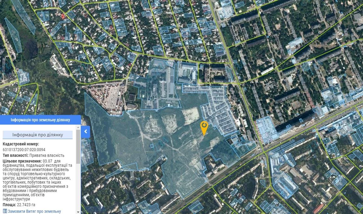 Ага, там походу будет очередной ТЦ. Ну что, тоже точка притяжения. От ХГ туда топать далековато. И еще одно. Для многих, живущих в западном пригороде Харькова (Песочин, Солоницевка и т.д.), было бы удобно доезжать до конечной метро на своем транспорте, ставить его на перехватывающую стоянку, и дальше по городу ехать уже на метро. Но на ХГ катастрофически нет места для такой стоянки. А вот в районе этого пустыря - вполне можно было бы соорудить. И ТЦ, и стоянку, и станцию метро.А вот что кадастровая карта говорит:
