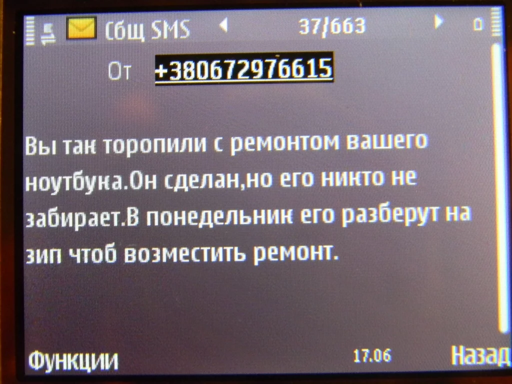 "Вы так торопили с ремонтом вашего ноутбука.Он сделан,но его никто не забирает.В понедельник его разберут на зап части чтоб возместить ремонт"