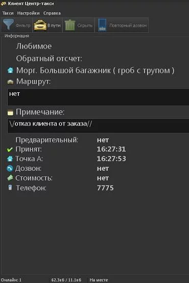 Только я взял этот заказ и отбился в ожидании номера клиента, чтобы высказать ему какой он молодец и остряк, как сразу же отказ клиента)))