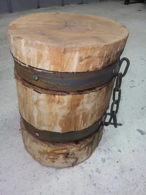 А я сегодня без заказов, но дома оно не сидится вот и сделал давно запланированную колоду для рубки мяса. Дубовый пень привёз ещё раньше с деревни, полосы два метра купил на металлобазе.