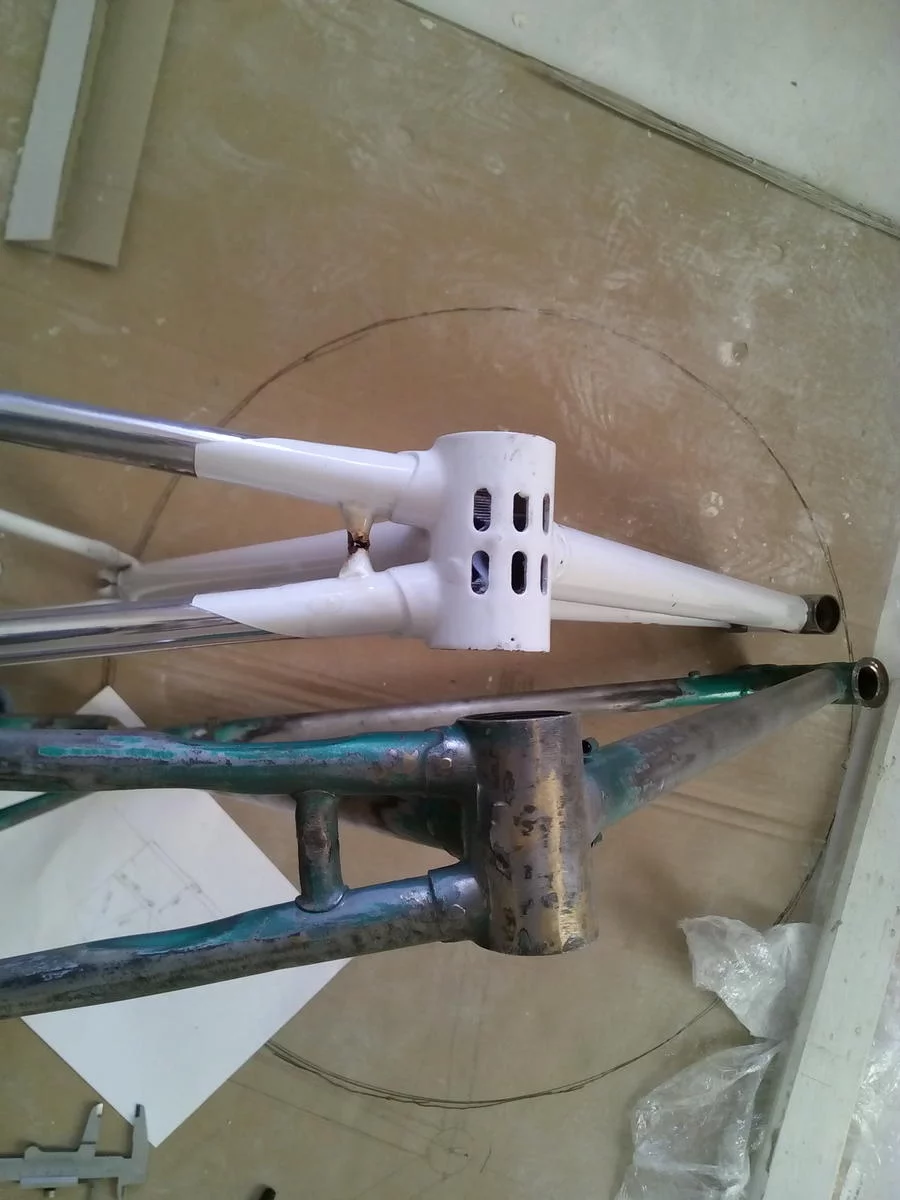 У него занижена рулевая колонка для жесткости. Чем больше ростовка велосипела, тем сильнее рама по форме превращается в трапецию, а надо стремиться к треугольнику, что и сделано на тахионе. Даже если брать забугорную классику и сравнивать с ХВЗ, то видно что сечение труб стартона меньше, а форма труб от каретки до оси заднего колеса еще и отличается сильно по форме.