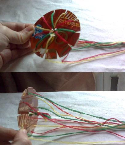 Достаточно легкая в освоении техника плетения тесьмы.Если брать яркие нитки,пряжу,то получаются веселенькие,радужные пояса,очелья,можно сплести фенечки и так же использовать для украшения одежды,как тесьму.