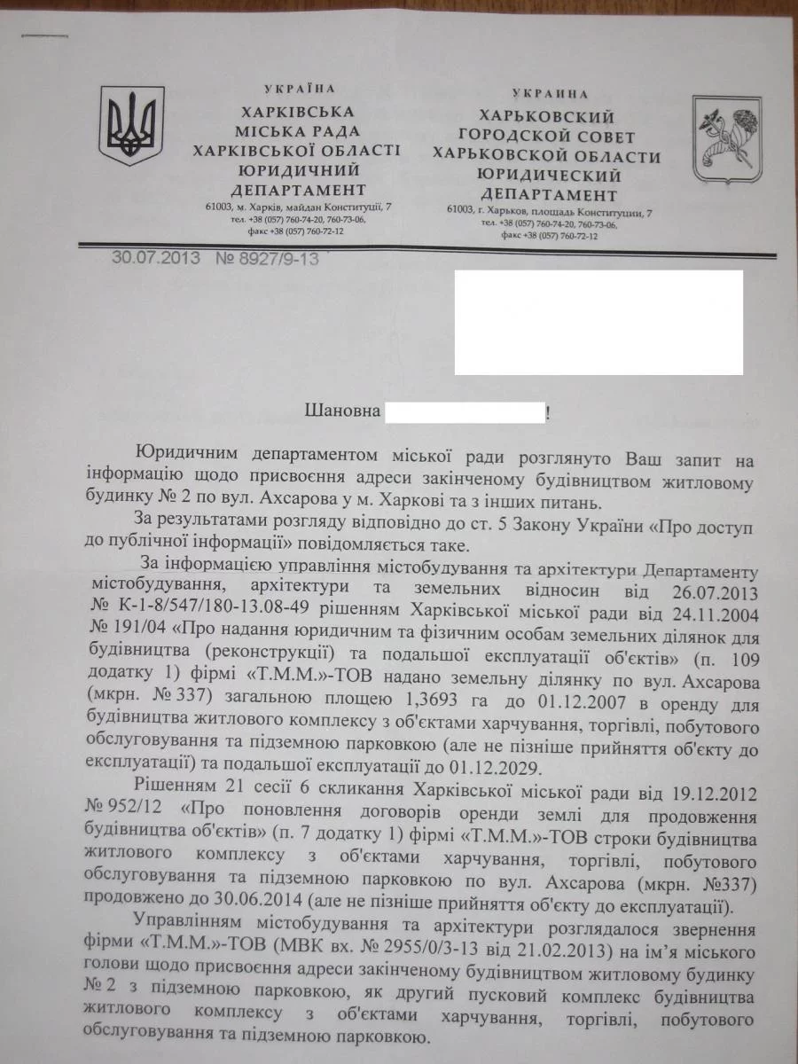 1. Повідомити чи надано Фірмою «Т.М.М.» до Харківської міської ради заяву про присвоєння поштової адреси вказаному будинку, якщо так то повідомити реквізити реєстрації (дату та номер);