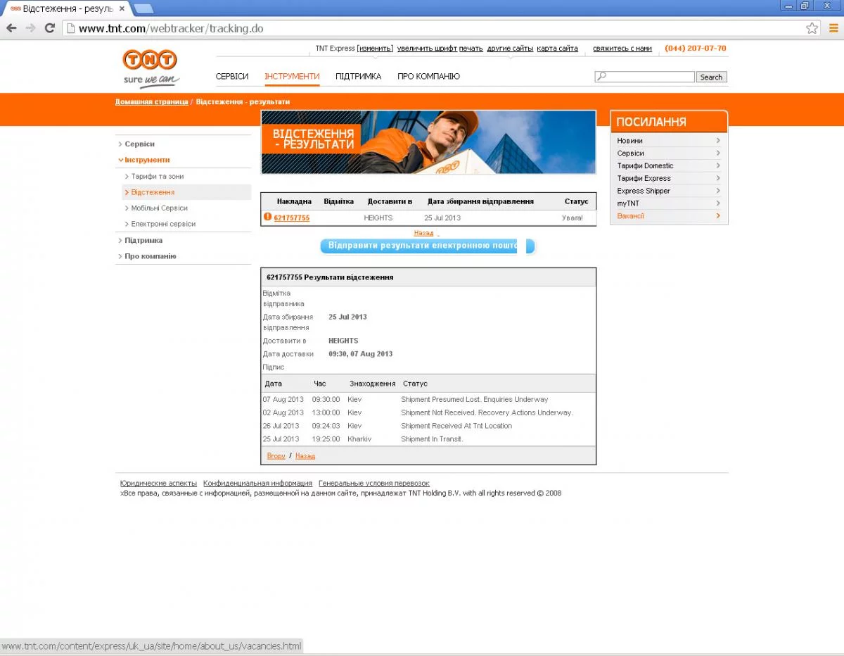 TNT потеряли мое отправление Харьков-Хьюстон.