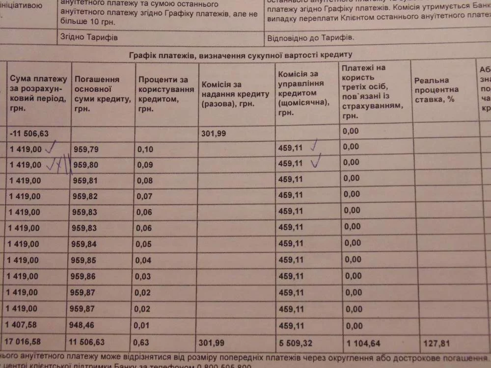 будте осторожны с кредитами особенно укрсиббанк! хотели взяиь кредит на 10000грн. консультан озвучил сумму переплаты 1500грн т.е. 11500всего к оплате в течении года. но когда дошло да бумажек оказалось общая сумма 17016.58грн из них 11506 погашение основной суммы кредита 0.63грн проценты, 302грн комисия, 5510грнза карточку,1105страховка. т.е. при нехитрой математике получаеися 70%годовых я был в ахуе!