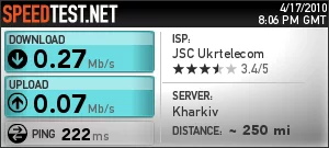 Свежий тест сегодня утром на Киев: 0,5 Мб/с / 0,04 Мб/с при пинге 468 мс на Киев.