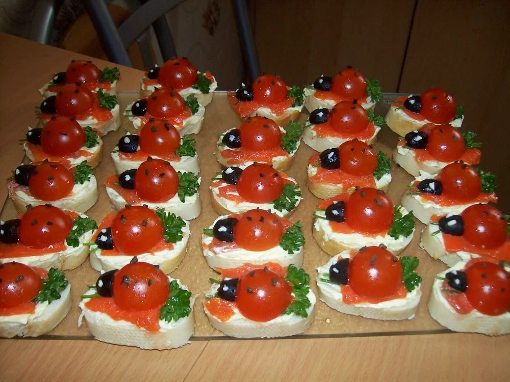 На порезанный багет намазать масло,положить ломтик красной рыбы,на краешек петрушку,половинку помидорки Черри,у которой сзади сделать надрез ввиде треугольничка.Из чёрной маслины сделать голову,к ней приложить усики из веточек петрушки,крапинки из мелко порубленных маслин,из майонеза глазки...