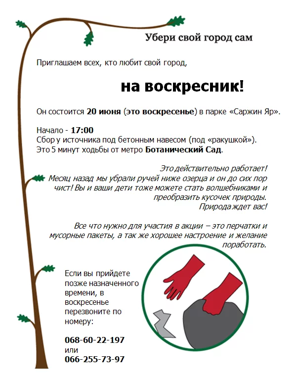 Все что нужно для участия в акции – это перчатки и мусорные пакеты, а так же хорошее настроение и желание поработать.