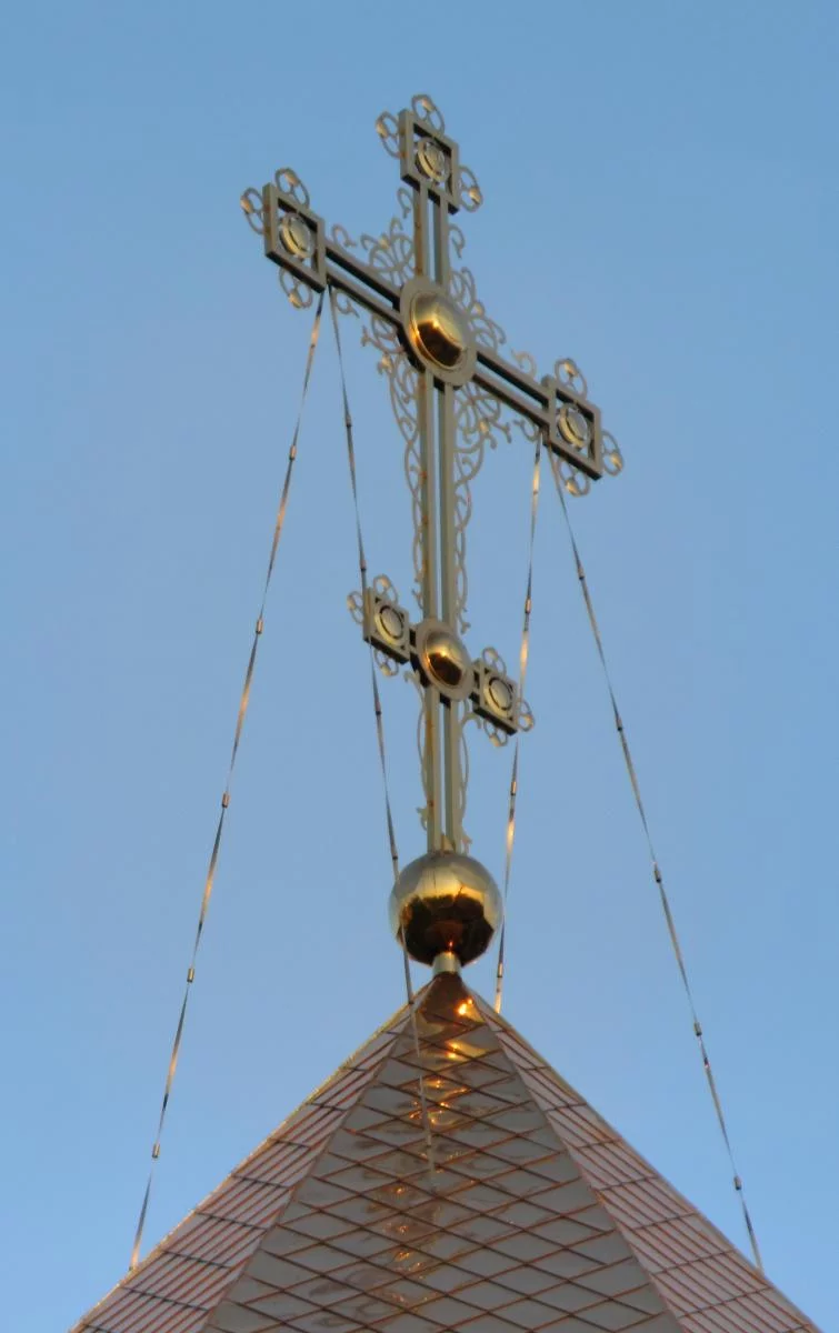 Так как снималось уже на закате, и кадров много, на небе заметна неоднородность. Попиксельная резкость всёже не дотягивает до отличного результата, в том числе и изза недорогой компактной камеры. Хотя на отдельных кирпичах видны изъяны, а на верхнем кресте едва просматриваются заклёпки (или болты?)
